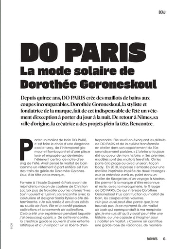 J’ai créé DO PARIS comme on dessine une silhouette : avec exigence, intuition et précision. Chaque maillot épouse le corps et accompagne le mouvement grâce à des jerseys italiens haute performance, résistants au chlore, anti-UV et au lycra OEKOTEX recyclé.