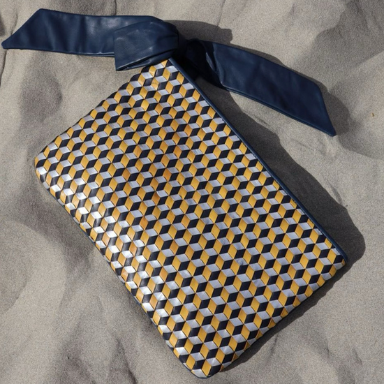 Une grande pochette en cuir tressée.